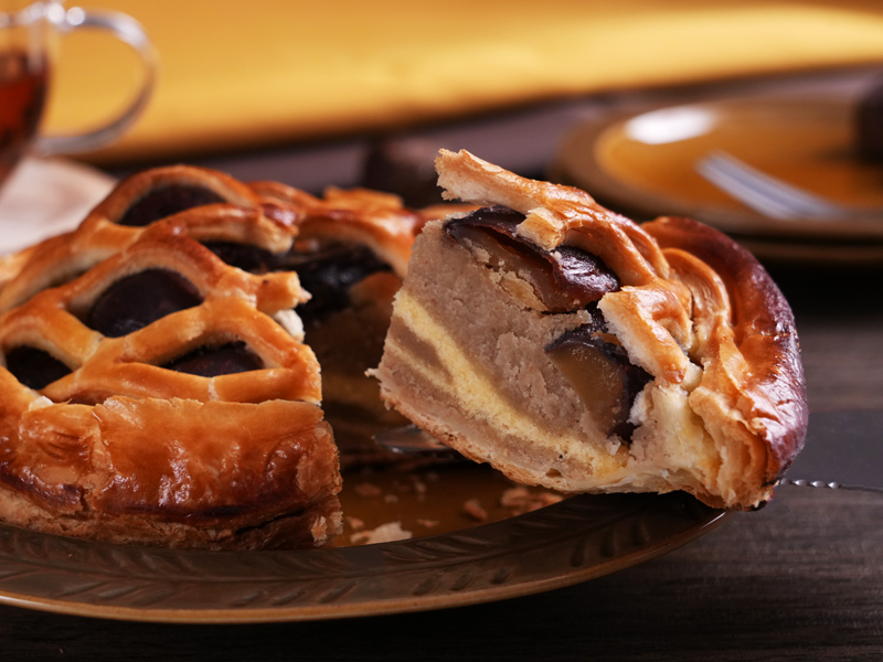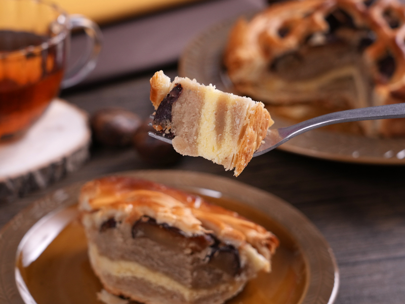 パイ生地のサクサク感と、渋皮栗のほろ苦さ、マロンペーストの甘みが絶妙にマッチし、贅沢な味わいを楽しんでいただけます。