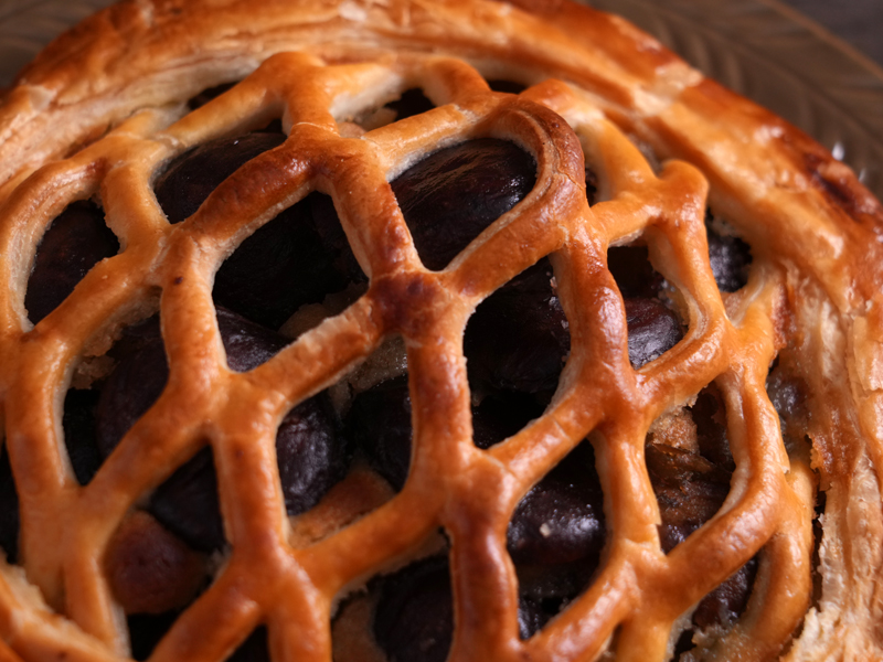 発酵バターをたっぷり使用したサクサクのパイ生地に、贅沢な自家製マロンフィリングと、ホクホク美味しい大粒の渋皮栗を包み込んだ季節限定のマロンパイです。