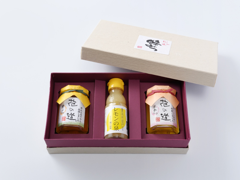 自然の花々から採れた国産蜂蜜「花の道」2本と、広島県瀬戸田産の「エコレモン」果汁を使用した「レモンの泉」を詰め合わせた、贅沢なギフトセットです。