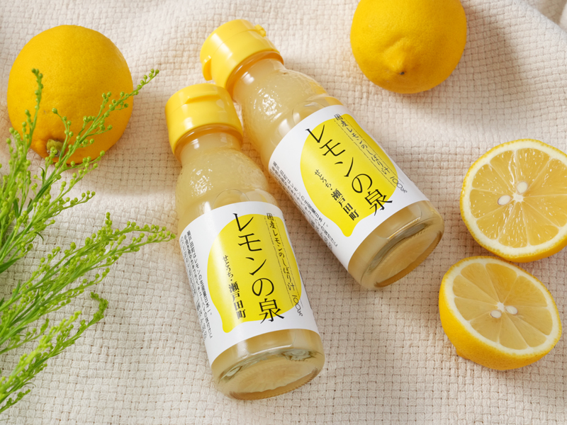 一緒にお届けする「レモンの泉」は、瀬戸田町の特別栽培農産物「エコレモン」を100%使用した、ピュアな国産レモン果汁。